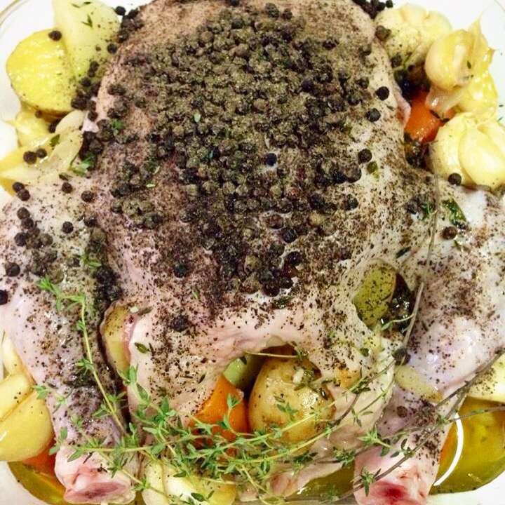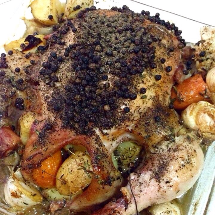 Place chicken breast side up in a large and shallow roasting pan. Using a large, long handled spoon, stuff chicken with the just-cooked potatoes and aromatics, scattering the remainder around the pan. Pour remaining cooking liquid over the potatoes and aromatics, not the chicken. Top chicken with whole black peppercorns. Roast chicken for 50 minutes to 1 hour, checking occassionally. Baste with rendered juices as necessary. Chicken is done when its juices run clear.