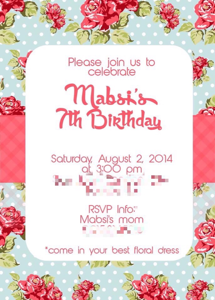 Being the party planner of my family, each year, she’d ask me what her theme would be. So last August, I thought I’d do a floral/ Cath Kidston party. I ordered the invitations from Etsy.com. It was so easy. I just sent an email to the seller, provided her all the details of the event and paid through paypal. She sent me a lay-out of the invitation via email, then I checked it for any revisions. Once everything is ok with you, the seller will email you the final copy. You can just print the invites yourself.