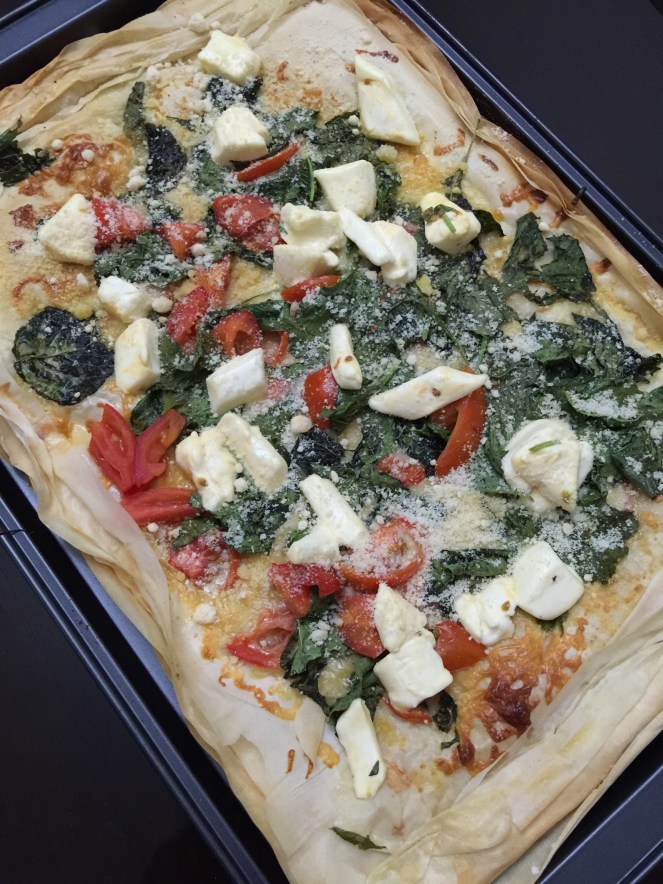 I was craving for pizza and remembered I had fillo dough in the freezer, so I decided to be creative with it. As they say, there’s always a first time for everything, it was fairly easy to make and the pizza turned out surprisingly good.