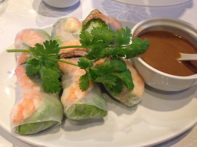 Goi Cuon fresh garden rolls with caramelized pork, steamed shrimp and rice vermicelli, served with a rich peanut sauce.