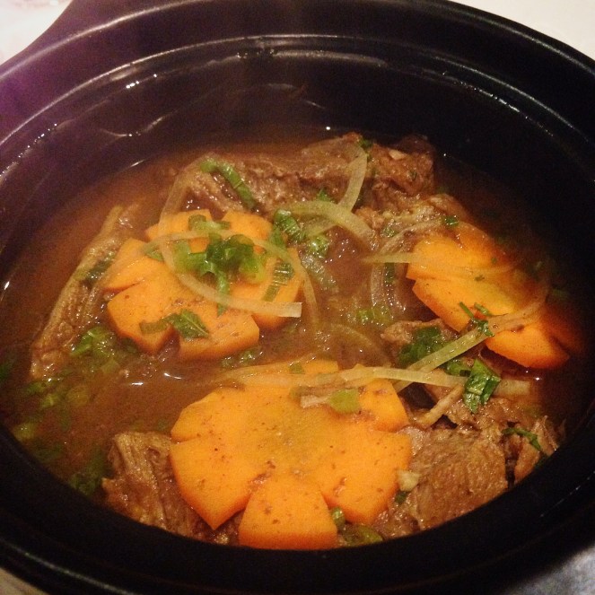 Bo Kho 12-spice slow-cooked beef stew with fried potatoes, carrots and lemongrass served with either a side of rice or flat noodles.