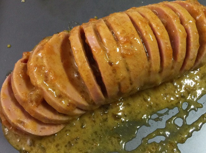 Put salami on the prepared baking sheet and pour apricot-mustard all over making sure it goes in between the slices.