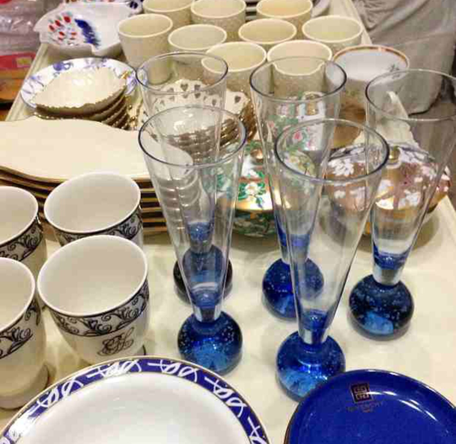 I started my small business by buying a few pieces. These were some of my favorites. The boat shape plates, leaf and heart shapes are all Lenox decorated with a 24k gold. I love these blue ball glasses! The sake cups are from Guy Laroche. I had these blue Givenchy plates and YSL bowls. The cream cups behind are Lancel.