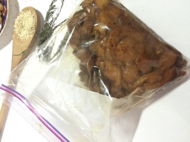 I mixed all the spices together in a bowl, placed the sliced chicken in a bag, added the mixed spices and olive oil, before refrigerating. You can either fry or bake it.