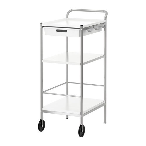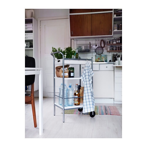 The Ikea bygel trolley only comes in white color and galvanized steel. Before I assembled it, I spray painted the steel in gold.