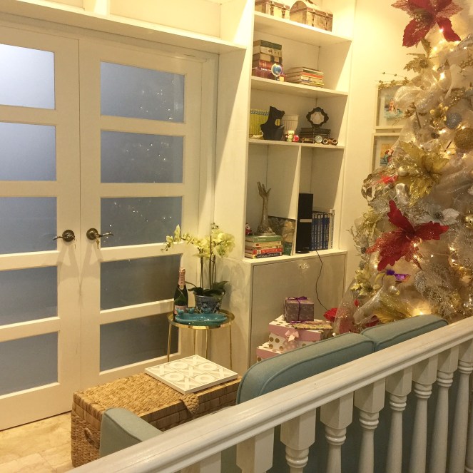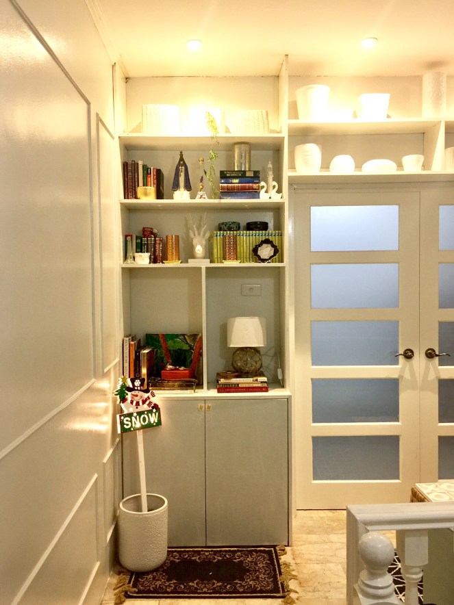 I wanted all the walls to be in light colors. They say never ever paint a small dark room in white because without natural lighting, the room will just look dead and boring so I painted the shelves in light gray instead but kept the walls, doors and railings in white. I am not a designer so I always desperately look for design inspirations from magazines, internet and pinterest. I almost enrolled myself into a bookshelf styling class online.