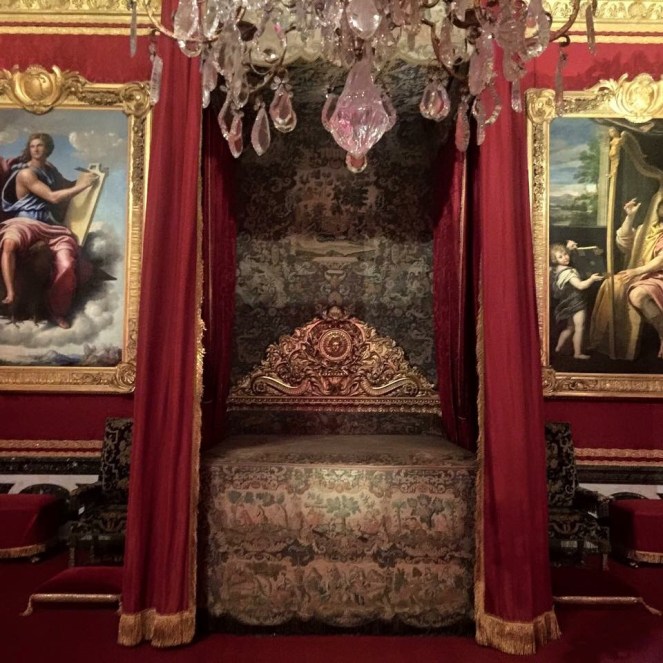 The King’s Bedchamber. It is the most important and symbolic room in the Royal Apartments. It was the location of two important ceremonies where the king would wake up (lever) and go to sleep (coucher) surrounded by his courtiers. The king also had a ceremony for putting on and taking off his hunting boots.