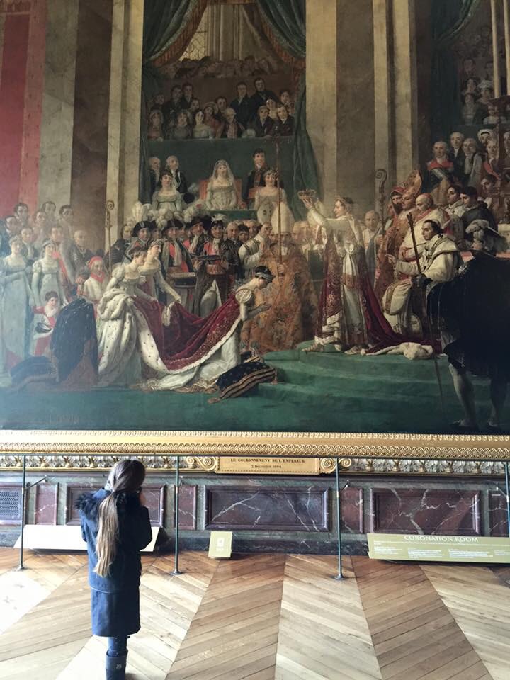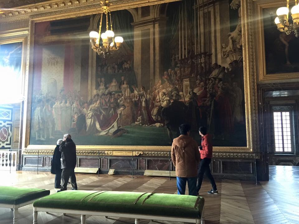 The Coronation Hall. This served as a guards’ room for both the King and Queen. The name was derived from the large painting of the coronation of Napoleon which takes up an entire wall. Upon close examination, the figure kneeling is not Napoleon, but his wife Josephine. Holding the crown that is about to grace her head is Napoleon. Behind him stand the religious figures who would usually perform the coronation duties and rituals. Napoleon had reportedly seized the crown from the hands of these clerics and placed it on his head, signifying his absolute rule and claim to power. While Napoleon did not reside in the chateau, apartments were, however, arranged and decorated for the use of the empress Marie-Louise. The emperor chose to reside at the Grand Trianon.