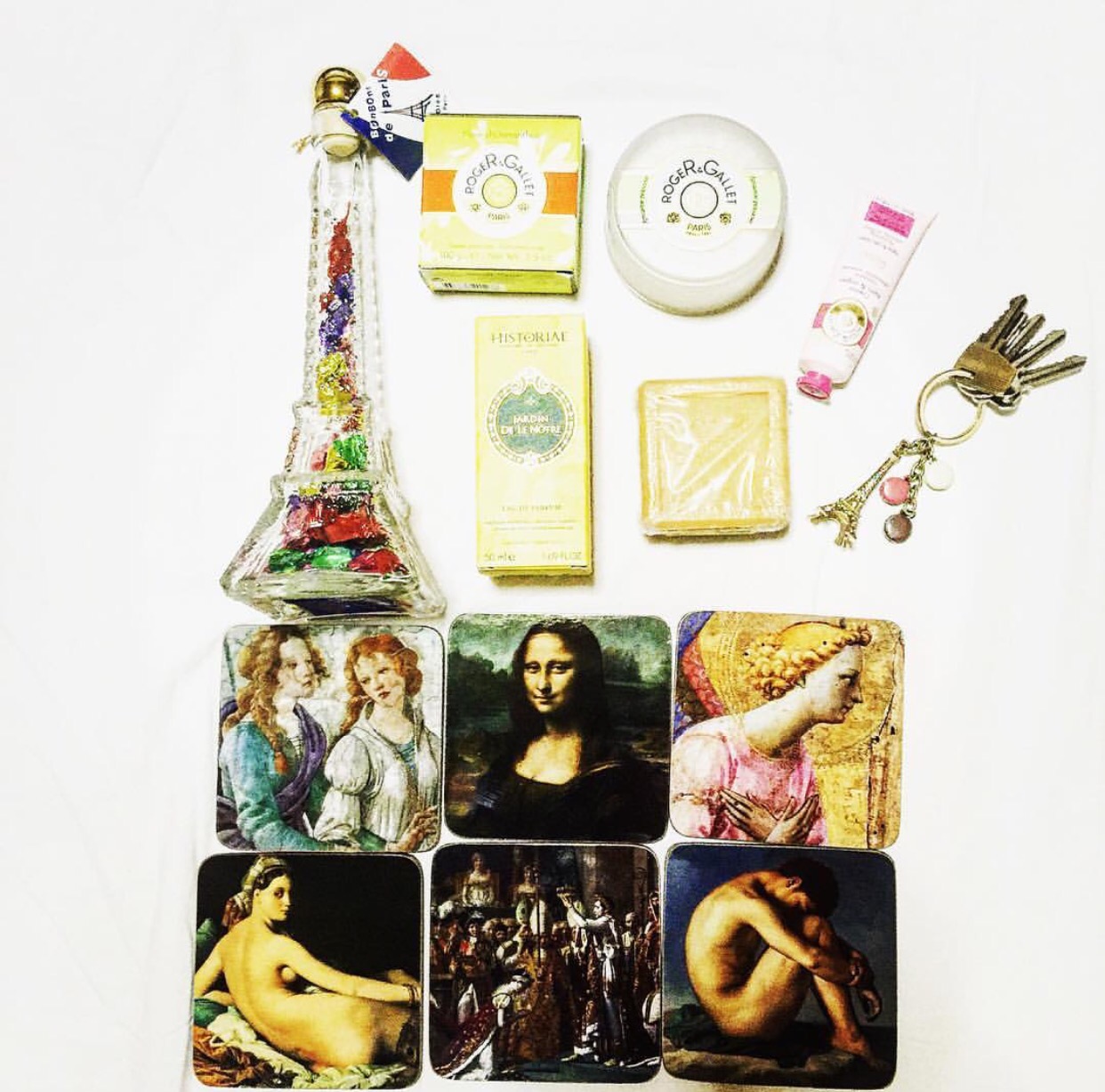 I bought some coasters from the Louvre Museum, Eiffel Tower key chain and bottled filled with bonbon on the second floor of the Eiffel Tower, Historiae perfume at the Versailles Palace and Roger & Gallet soap in a drugstore at Paris Gare de l’Est.